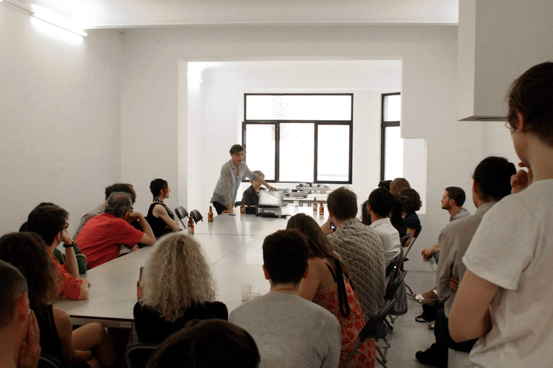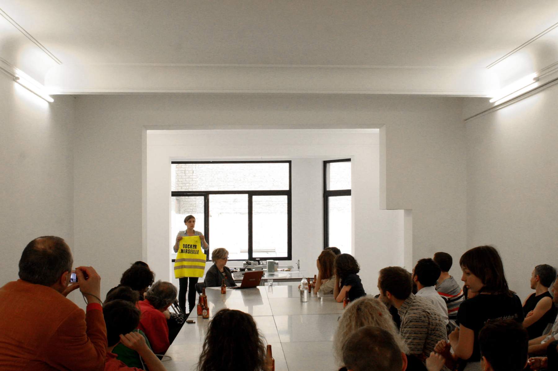 This is the reason why Marie Reinert, who is little inclined normally to let herself be politely taken over by preexisting forms or fashions, decided to free herself of the traditional configurations of the monograph. She proposes playing out the story of her past works in an improvised performance / interview with the curator and art critic Marie Frampier in a scene made up of tools referencing in part her past infiltrations. A script that is on hand during the performance, “borrowed” for the occasion from a public company, will meticulously document and archive live the flow of the discussion. That discussion will soon be published in book form.