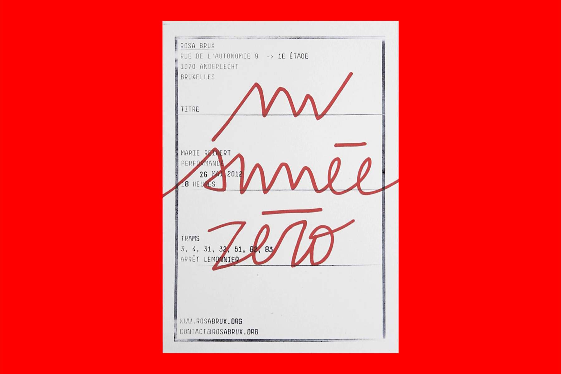 The inaugural exhibition of the Rosa Brux collective art venue is devoted to the French artist Marie Reinert and the impossible connection generated by the adaptation of her work to the format of the monographic catalogue. The chance to rethink what in a performative practice like Reinert’s immediately renders the question of her archive problematic. The immersion she undertakes in each of her interventions, the compromises, and the infiltrations that fully take part in her practice and amount to so many ways of working her way into the interstices of the current order and power – once they have been transcribed into the form of an archive, these remain in a blind spot, hidden by the object that has been produced, the tool or the work of art.