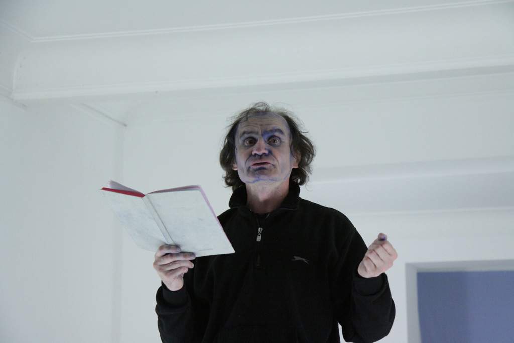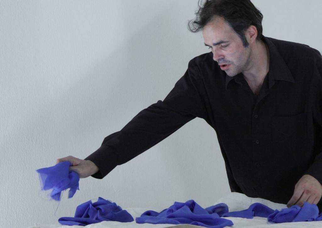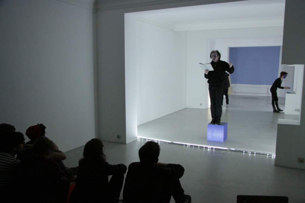 L’heure bleue, forme que peut prendre le crépuscule, fournit le contexte métaphorique à la peformance éponyme de Georg Keller (Zoug/CH, *1980). Dans une mise en scène faisant intervenir trois figures autonomes, l’artiste suisse étaye une critique à l’égard du jeu économique. Un vendeur de rues, habile et rapide, conscient d’agir dans l’illégalité, mène son commerce à l’abri du regard d’un employé de grand magasin, saluant mécaniquement le client potentiel. Fonctions de représentation, illusion réconfortante du travail bien effectué, dissolution des identités et désengagement inconscient de soi au profit d’un système insidieux, enjeux parallèles de la dépense dans une société misant sur la consommation, sont certains des aspects qu’éclaire l’itération des faits et gestes des acteurs. A cette double perpétuité vaine s’ajoute l’intervention d’un troisième protagoniste qui scande, à la manière des Speakers’s Corners londoniens, un texte de Charles Fourier (Besançon, 1772-Paris, 1837), publié en 1845 dans la revue La Phalange, à propos de la banqueroute.
