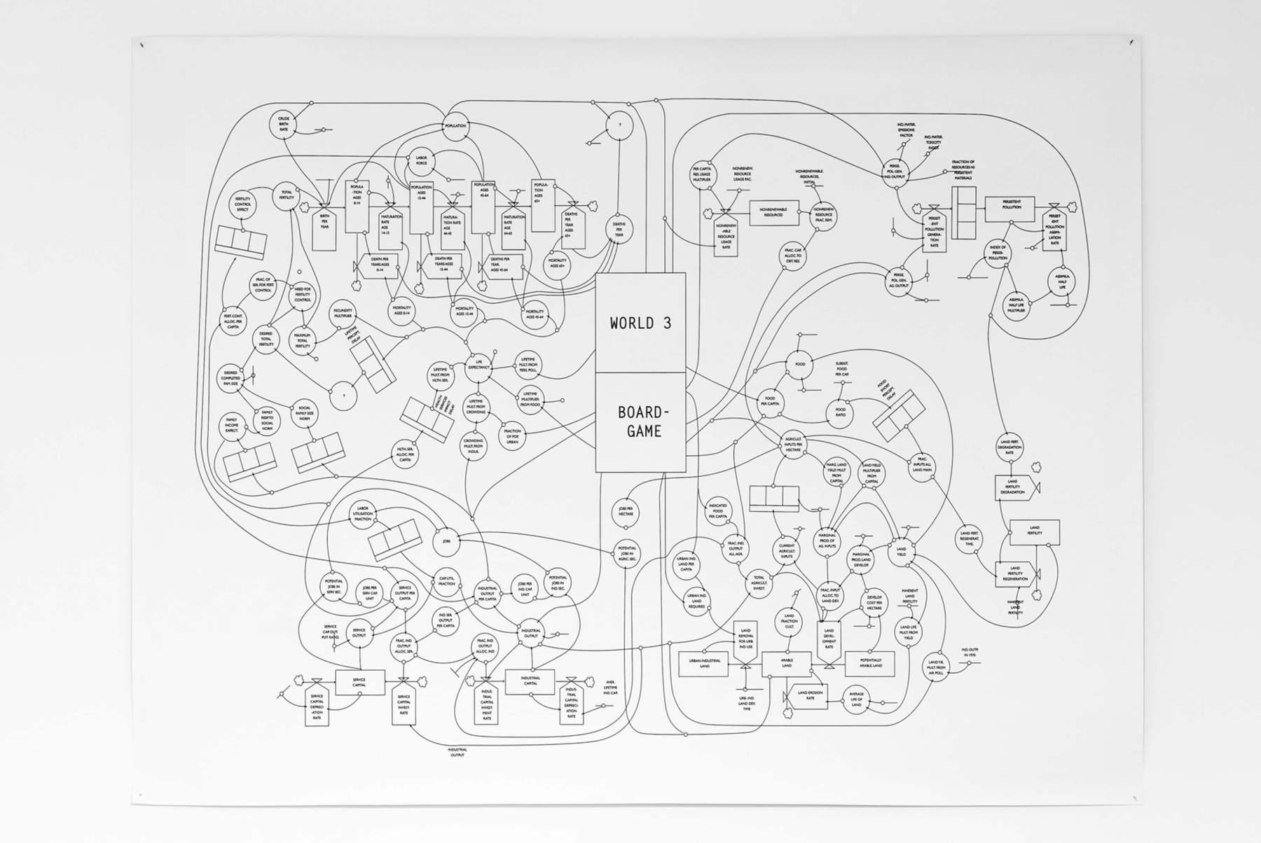 Dans le sillage de Guy Debord qui en 1977 conçoit sa version du jeu Kriegsspiel en reproduisant l’ensemble des rapports stratégiques et tactiques de la guerre selon le traité du général Clausewitz. Le world3 Boardgame de Defaux réunit l’ensemble des facteurs et des interactions qui caractérise l’humanité sous forme de pièces manipulables : la population globale, le capital industriel, les ressources naturelles, etc. Face aux diverses éventualités qu’ils sont prêts à envisager, les participants décident d’une stratégie à adopter et placent leurs pions en conséquence.